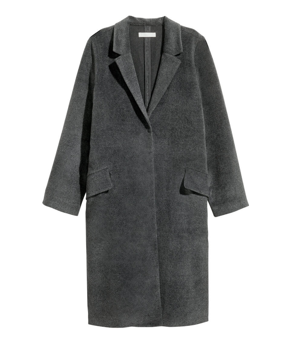 Description: Coat in soft. felted fabric with notched lapels, concealed buttons at front, and front pockets with flap. Unlined.
